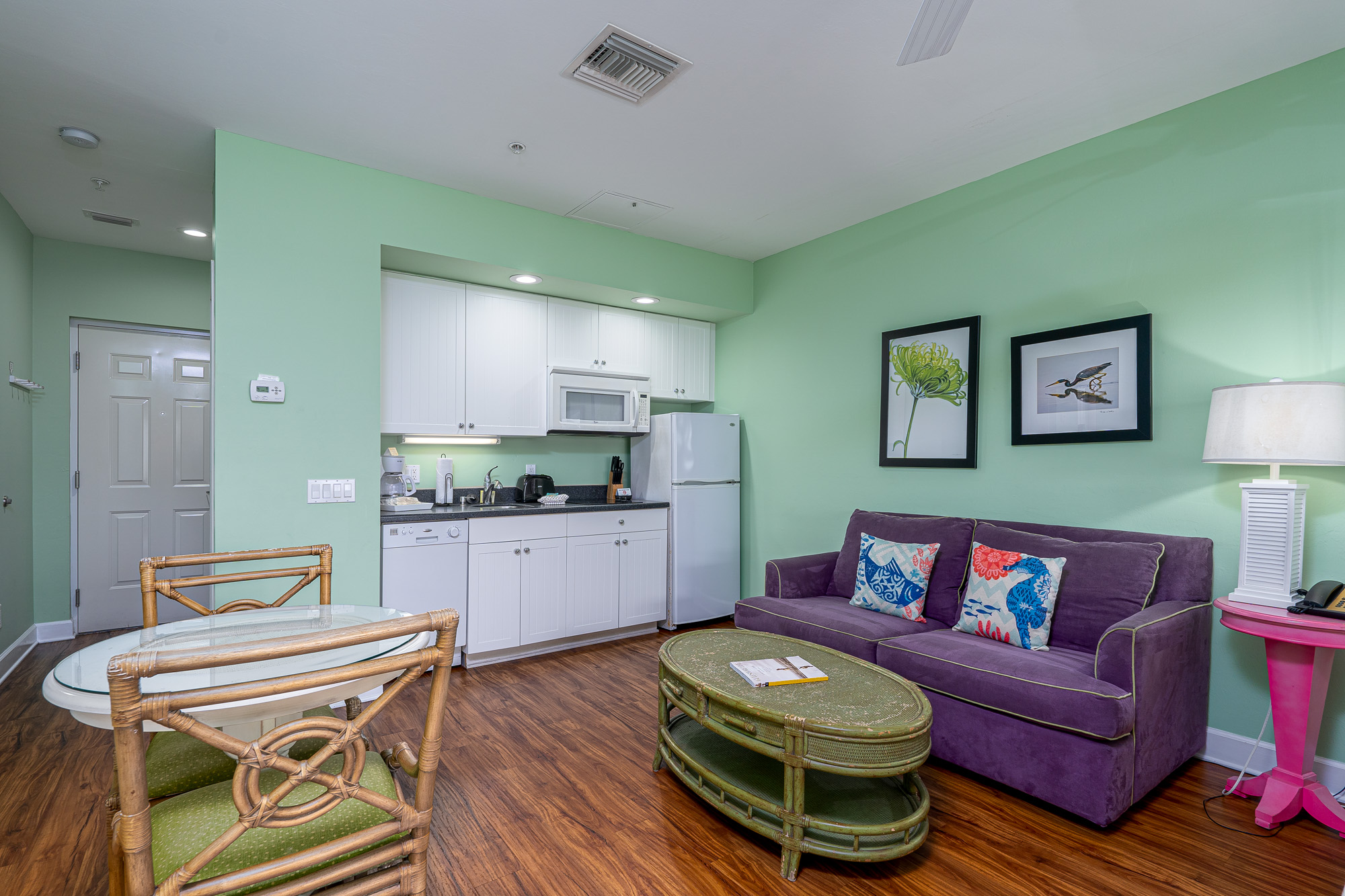 This studio has beautiful wood flooring and a beachy decor. The kitchen area has hard surface countertops, a stainless steel sink and cabinets with all the necessary items to prepare meals or just coffee and toast in the morning. Appliances include a 2-burner glasstop range, built-in microwave oven, a mini-dishwasher and refrigerator/freezer. Next to the kitchen the living area has a sleeper-sofa with coffee table and a dining table seating two. The sleeping area has a king-size bed, night stands and lamps, across from which is an armoire and credenza above which is a wall-mounted large flat screen TV. Sliding glass doors open to furnished covered balcony overlooking the street below with all the shops, restaurants and great views of the back bay with all its boating activities. The large bathroom has tile flooring and a vanity with lavatory and storage space beneath, wall mirror, commode and a tiled combination tub/shower.