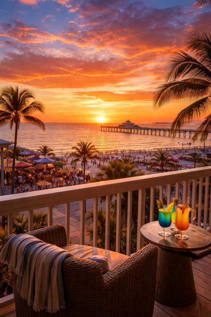 As evening arrives, walk to the beach again for what Fort Myers Beach is famous for — breathtaking sunsets that paint the sky in shades of orange, pink, and gold.